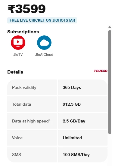 | Jio ₹3,599 | 2.5GB/day data, annual plan | 1 year |