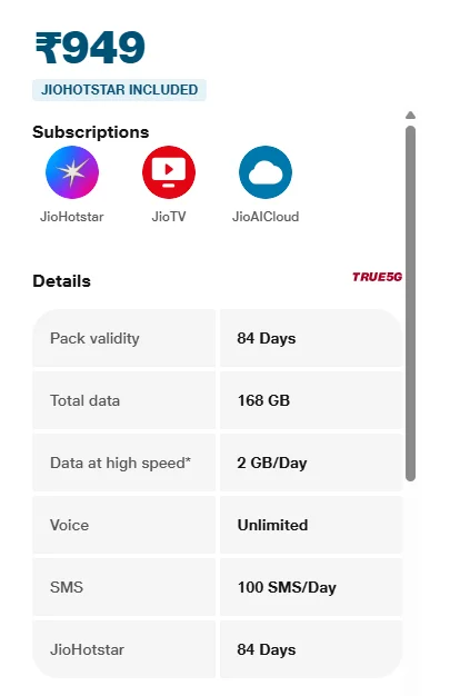 If you want to avoid frequent recharge, then the ₹949 plan is perfect for you. It has a long validity of 84 days, during which you get the benefit of 2GB data and unlimited calling every day. Along with this, 3 months JioHotstar subscription is also given, which can be enough for the entire IPL season. This plan is especially good for those users who want to watch the match uninterrupted for a long period.
